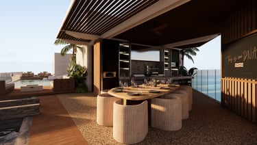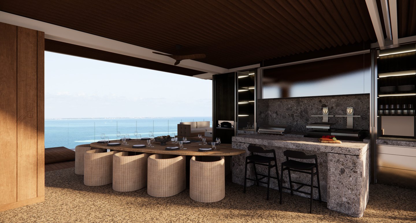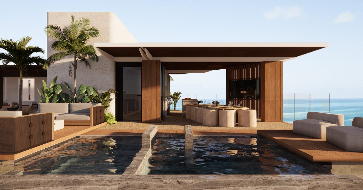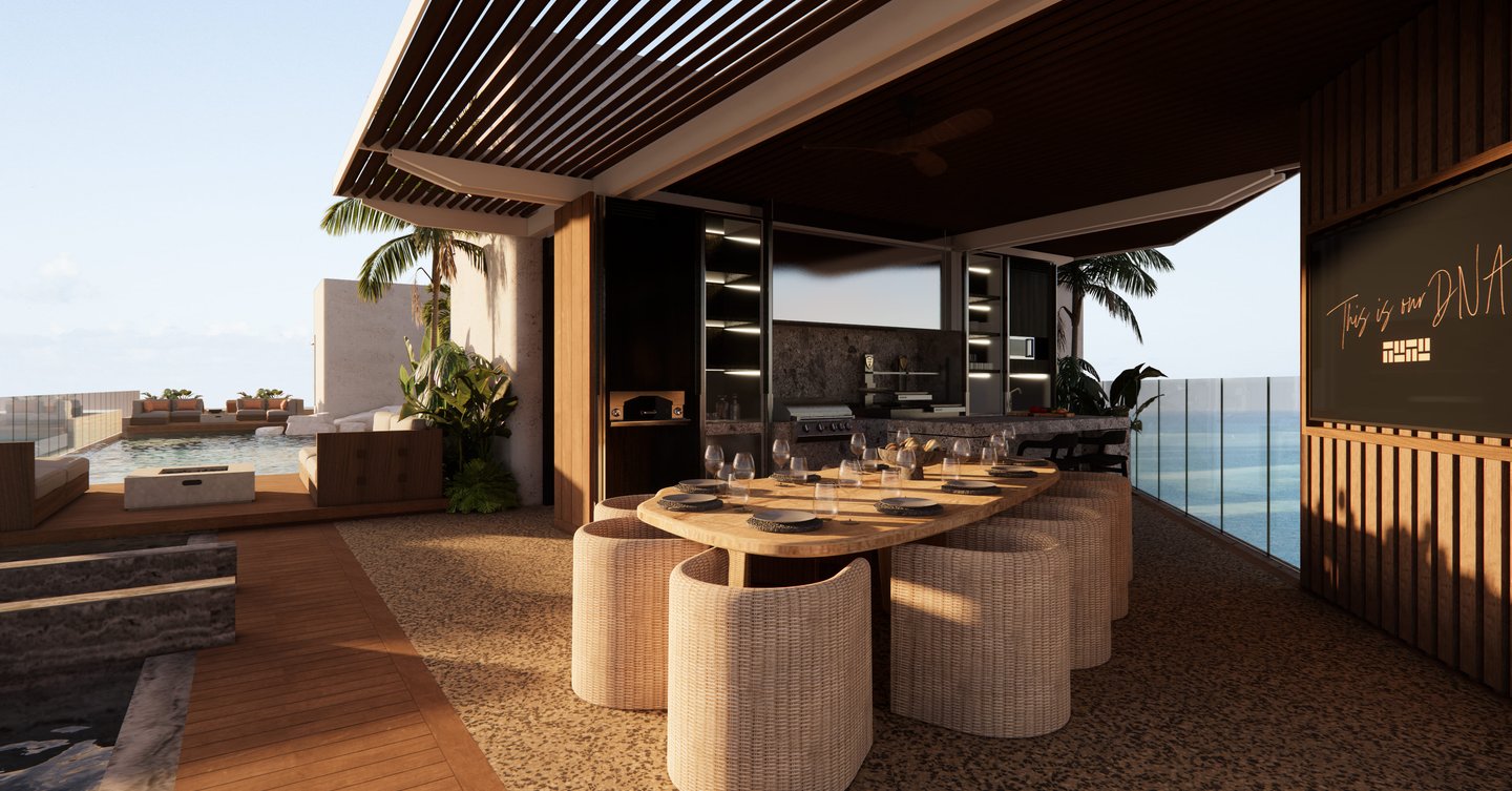 Diseño contemporáneo y elegancia, utilizando materiales naturales. El rooftop al libre integra comedor, cocina, zona lounge y piscina con vistas panorámicas al océano.