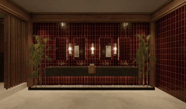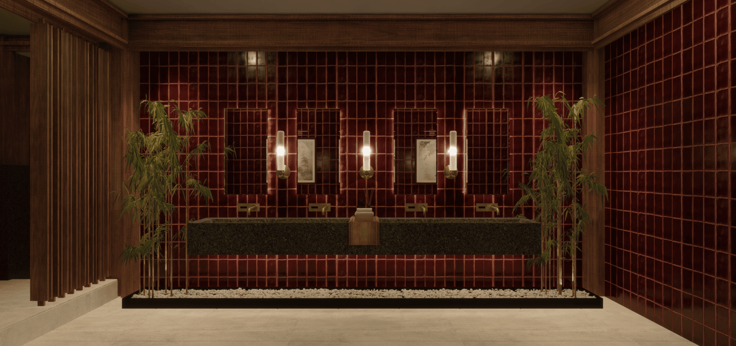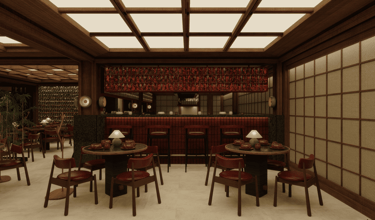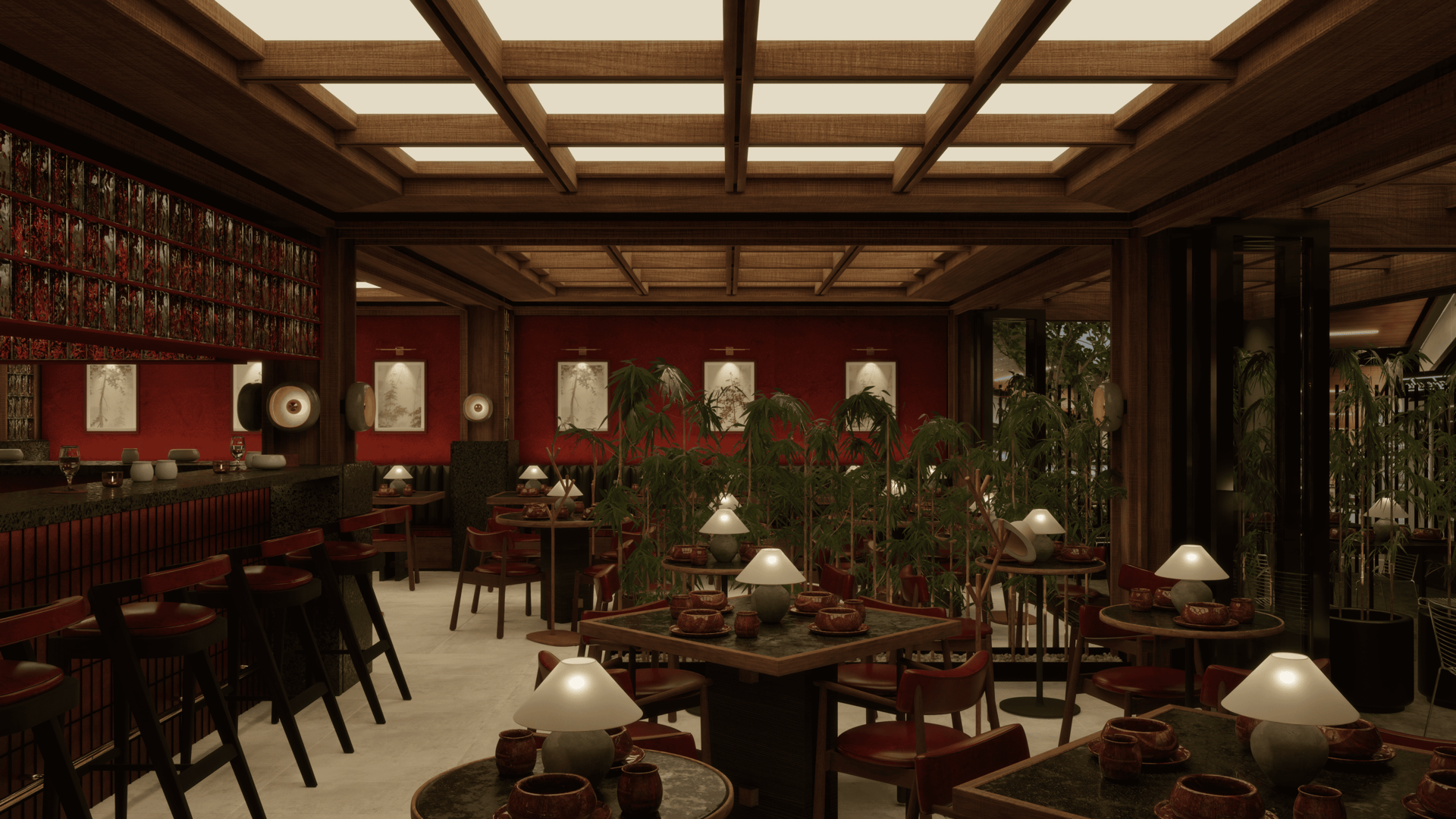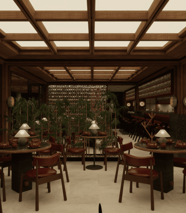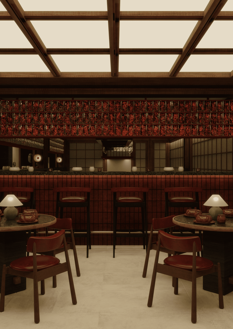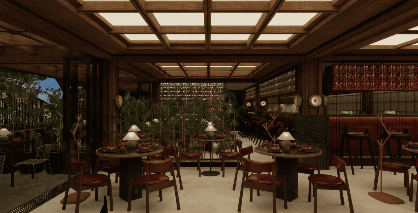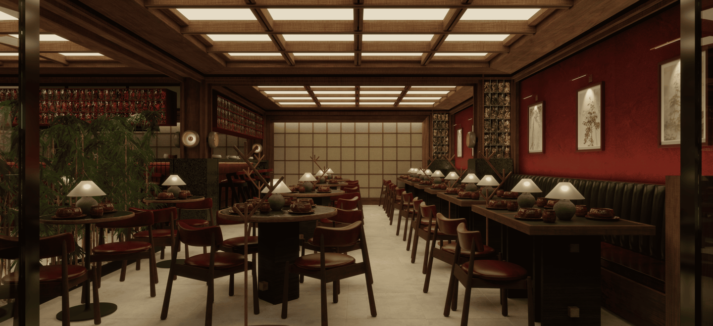 Restaurante contemporáneo con inspiración oriental, donde la atmósfera se construye a partir de la materialidad cálida, la iluminación controlada y una composición espacial envolvente.