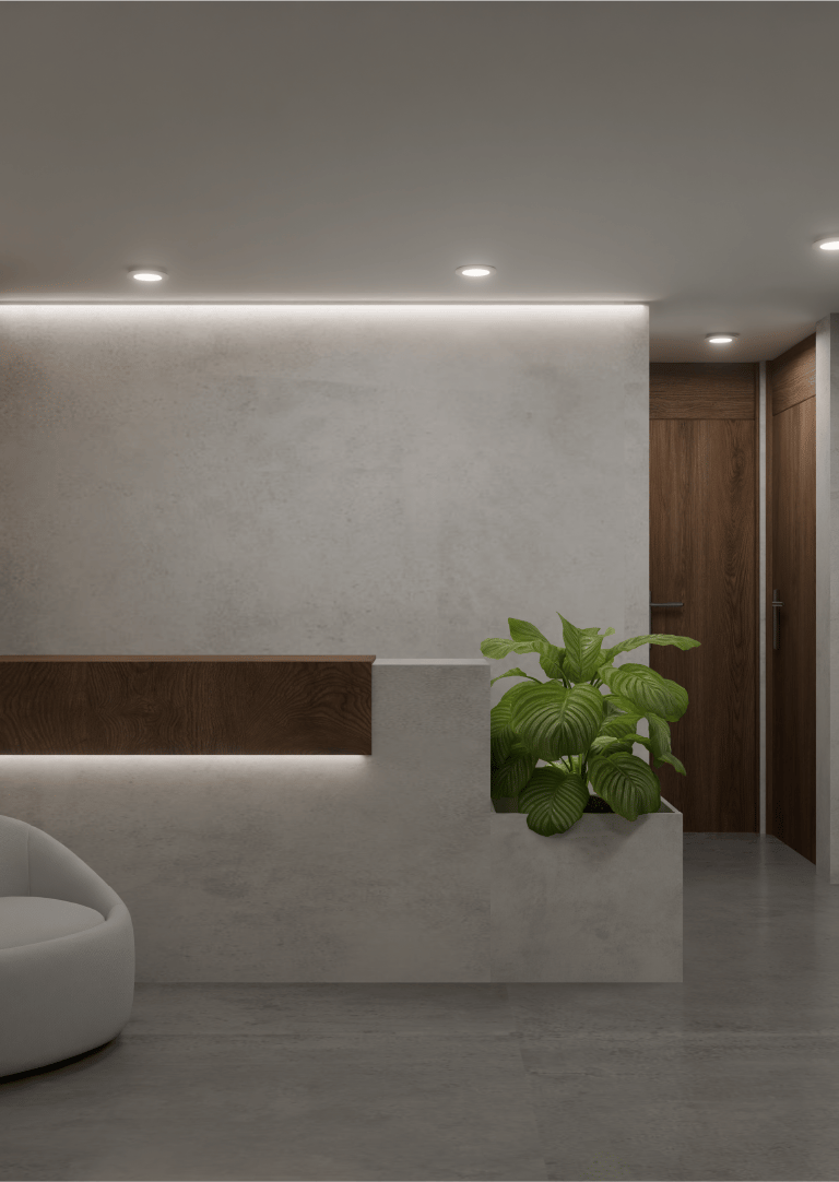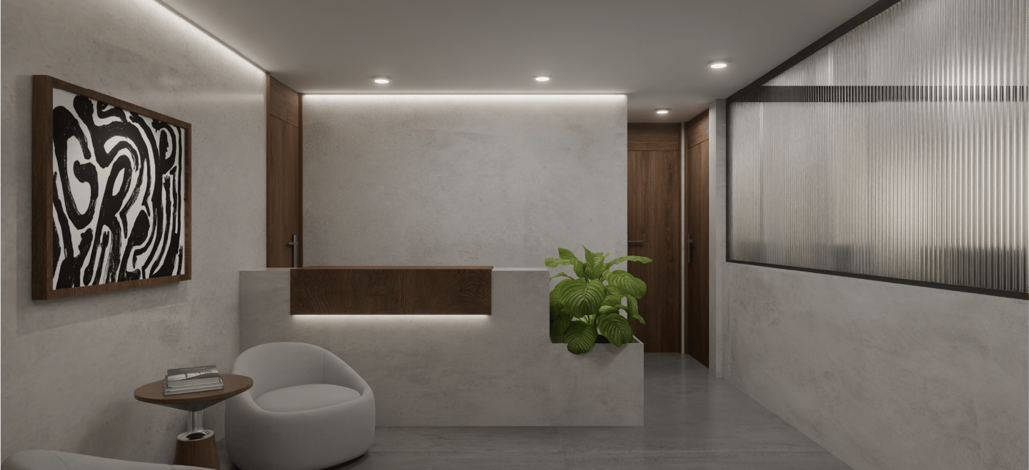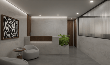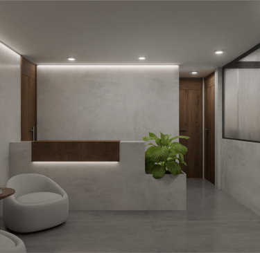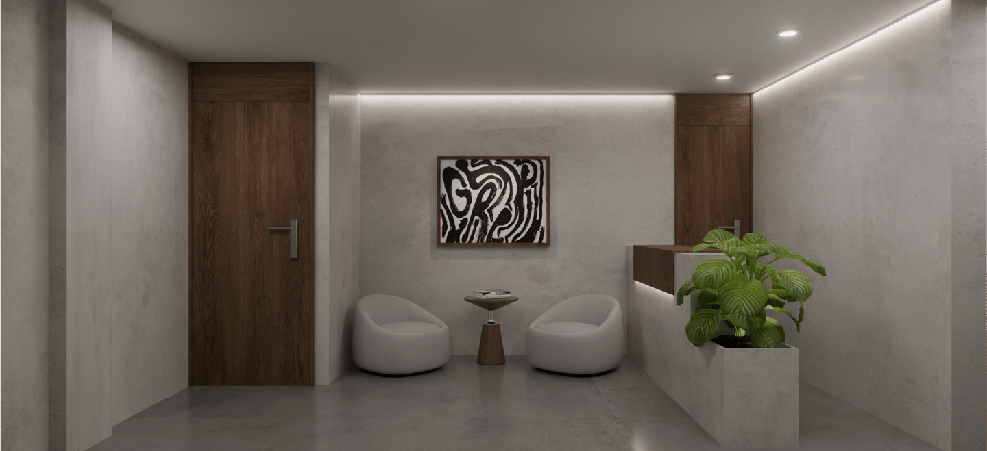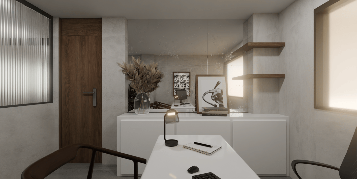 Este proyecto de oficinas plantea un espacio de trabajo colaborativo concebido bajo una estética contemporánea minimalista, donde la materialidad neutra y vegetación interior construyen una atmósfera serena y sofisticada.