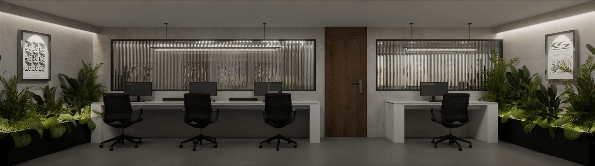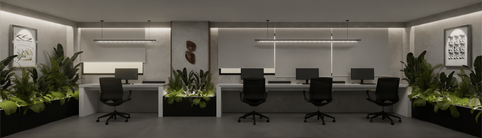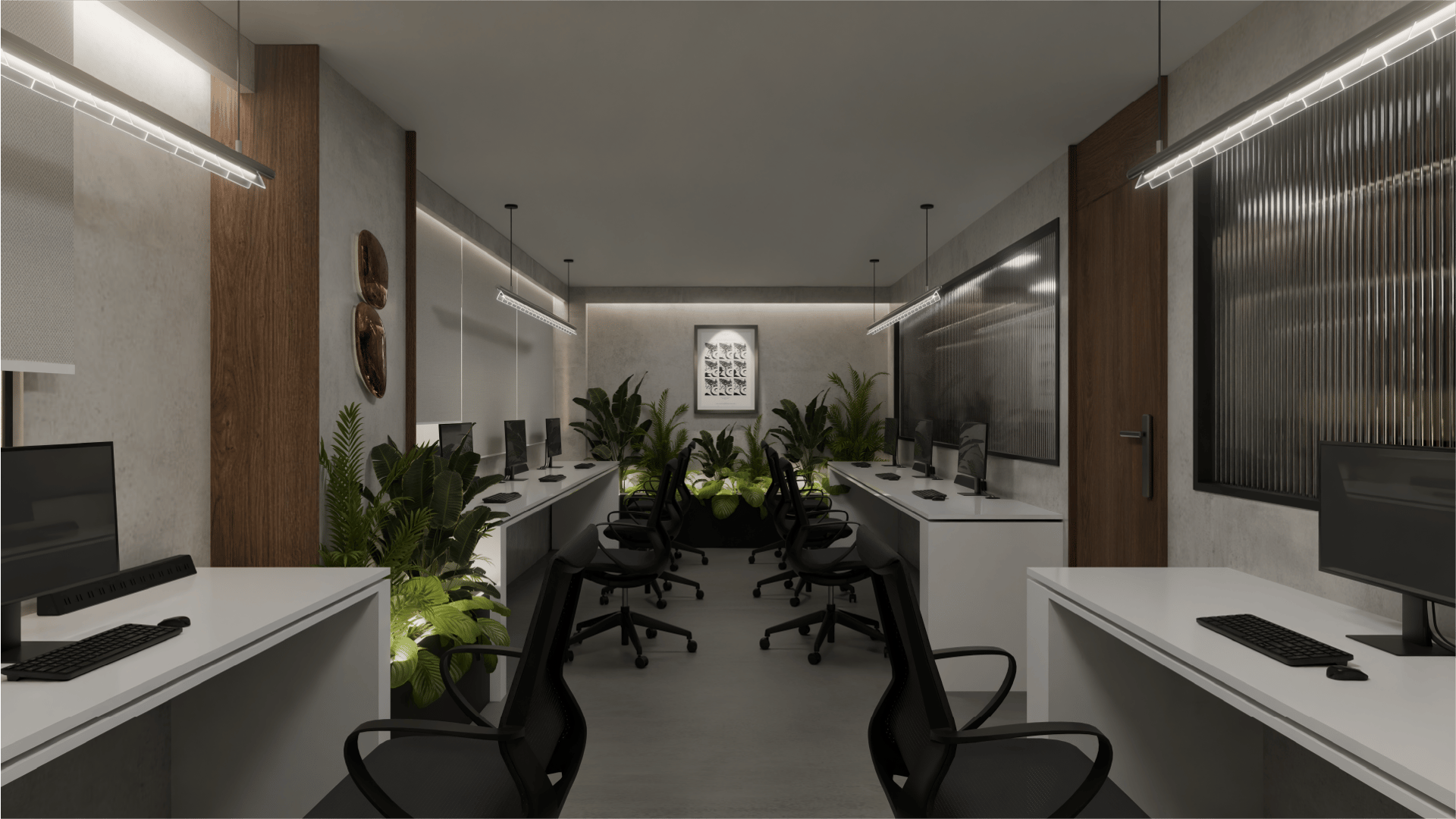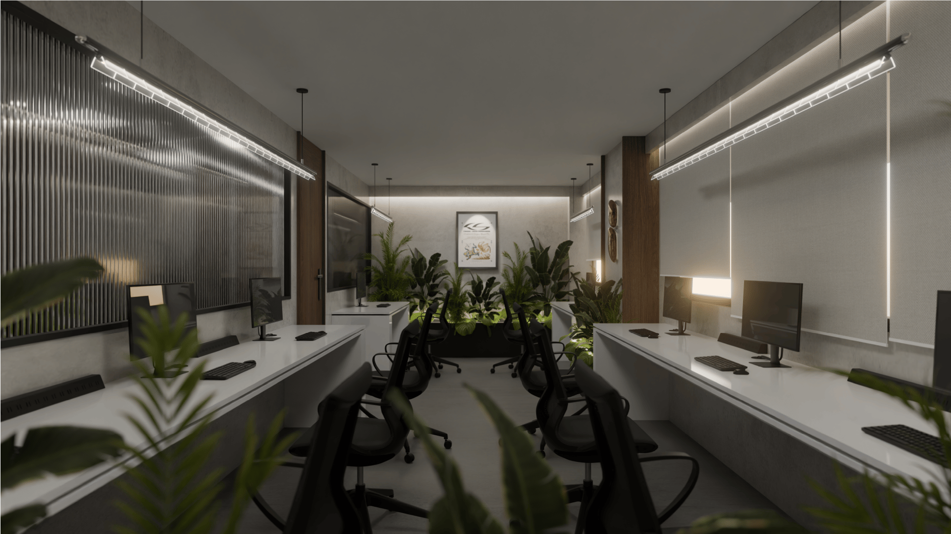 La propuesta se organiza a partir de un eje central verde, que funciona como núcleo compositivo y elemento biofílico articulador. Dos estaciones de trabajo lineales enfrentadas generan una configuración simétrica que enfatiza la profundidad visual y el orden espacial. La composición axial dirige la mirada hacia el muro posterior, jerarquizado mediante una pieza gráfica enmarcada y un sutil baño de luz indirecta.
