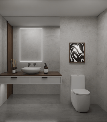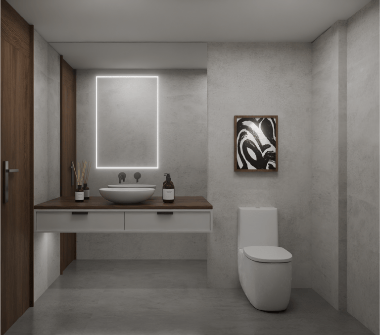 Una paleta sobria y atemporal, Muros de concreto aparente en tonalidades grises cálidas, superficies solidas de krion, carpinterías y detalles metálicos en acabado negro mate, el piso continuo en tono gris neutro refuerza la unidad espacial que combinado estos materiales genera una atmósfera brutalista y minimalista.